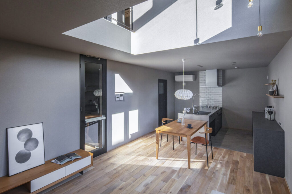 天井高2.5m、空間の水平・垂直ラインを美しく際立たせるハイドアとハイサッシを採用。また、オリジナルキッチンや鉄骨階段など意匠性の高い装備も標準仕様にしています。UA値0.46以下、C値0.6以下という高気密・高断熱も実現し、美しさはもちろん安心もハイレベルで満たします。